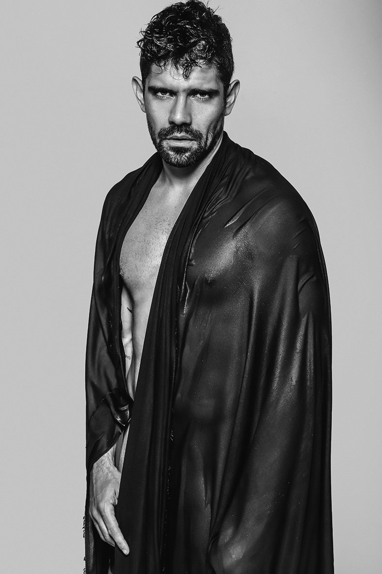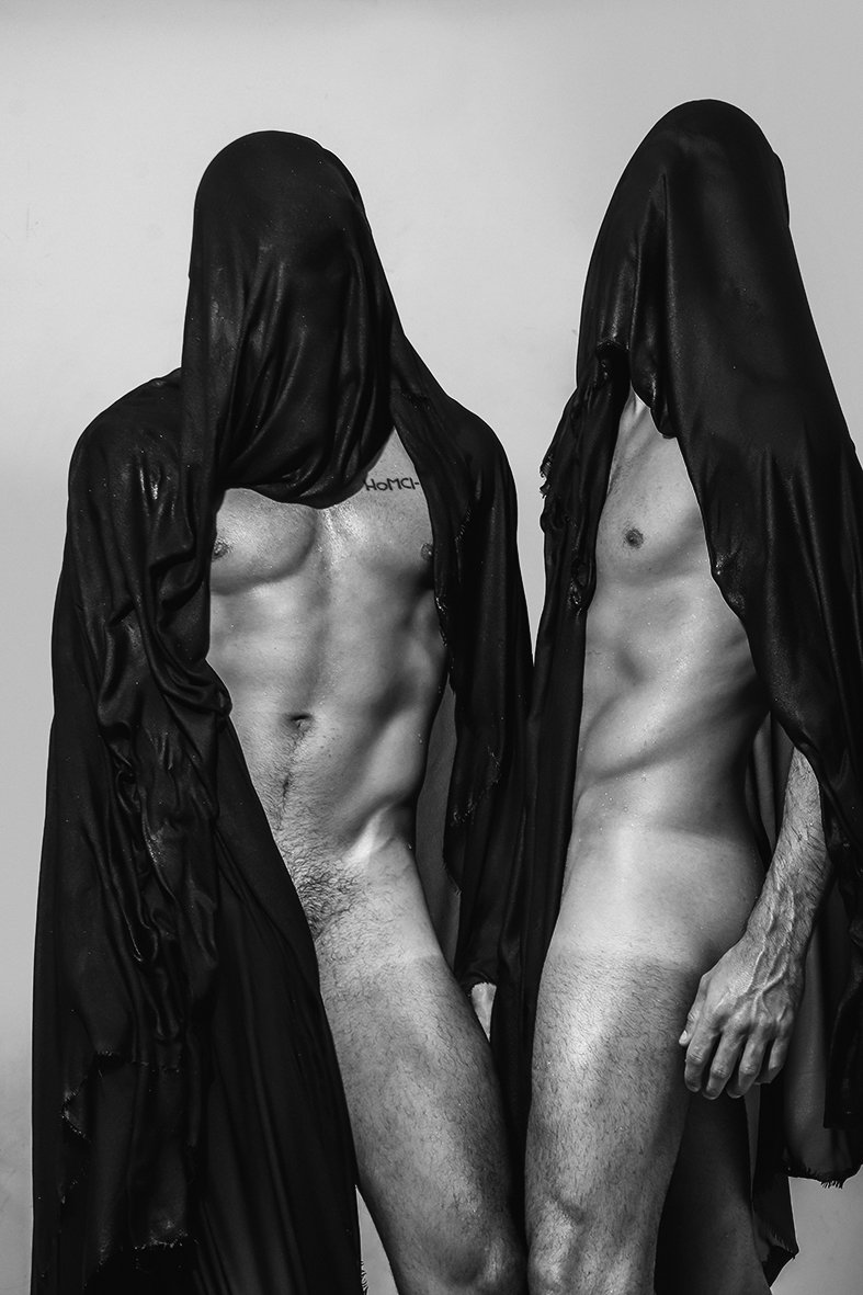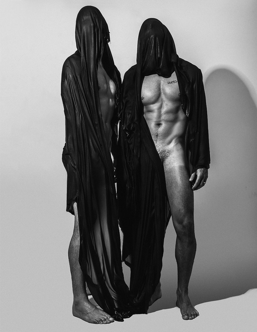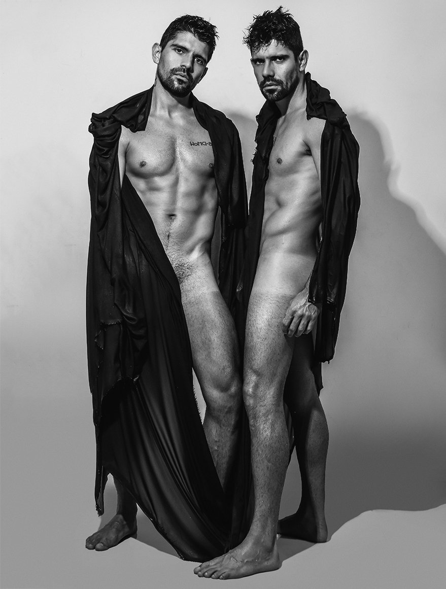Nas imagens, os irmãos posam totalmente nus, apenas cobertos por um tecido escuro molhado que evidencia as formas musculares e cria um jogo de luz e sombra extremamente estético. O contraste entre a delicadeza do tecido e a força corporal realça a sensualidade com elegância.