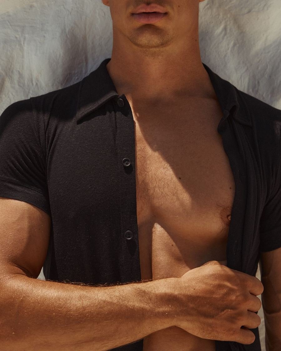 A campanha trouxe a coleção Linen, marcada pela sofisticação e pela sensualidade crua, mas foi George quem roubou a cena: cada pose, cada olhar, cada detalhe do corpo captado pelas lentes exalou testosterona e desejo.