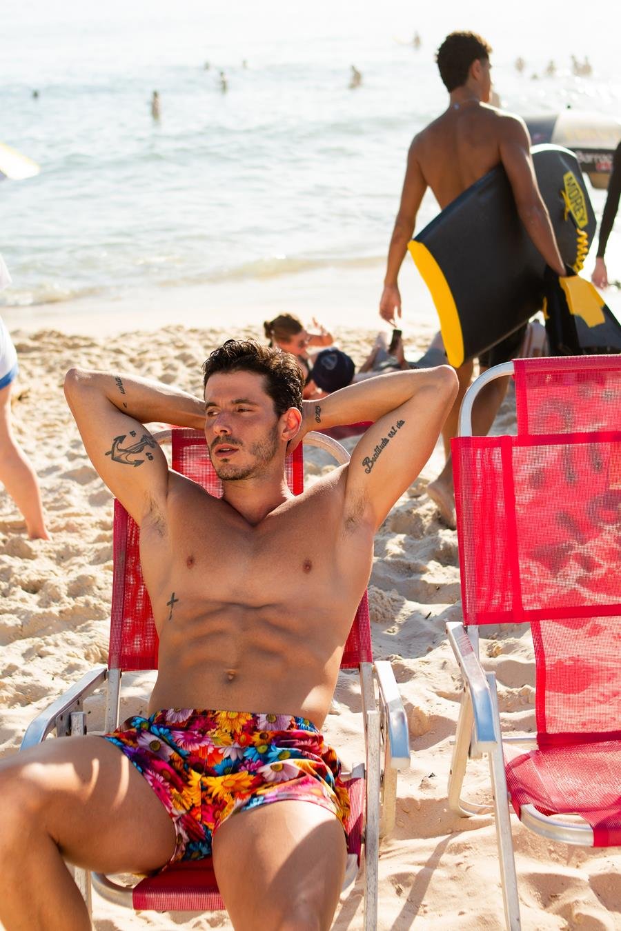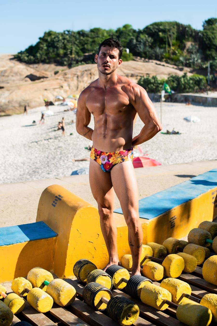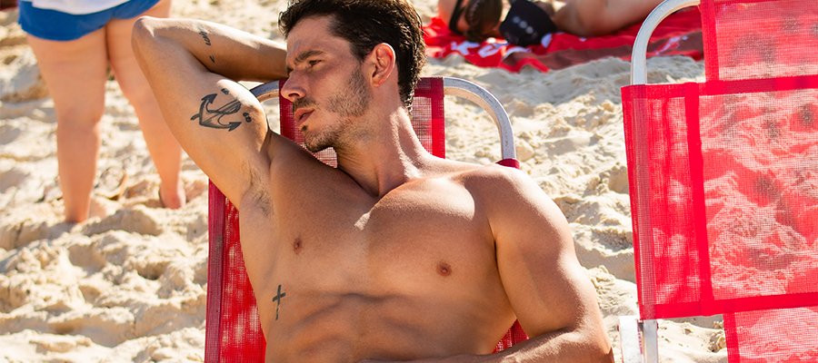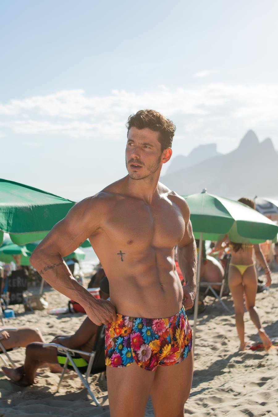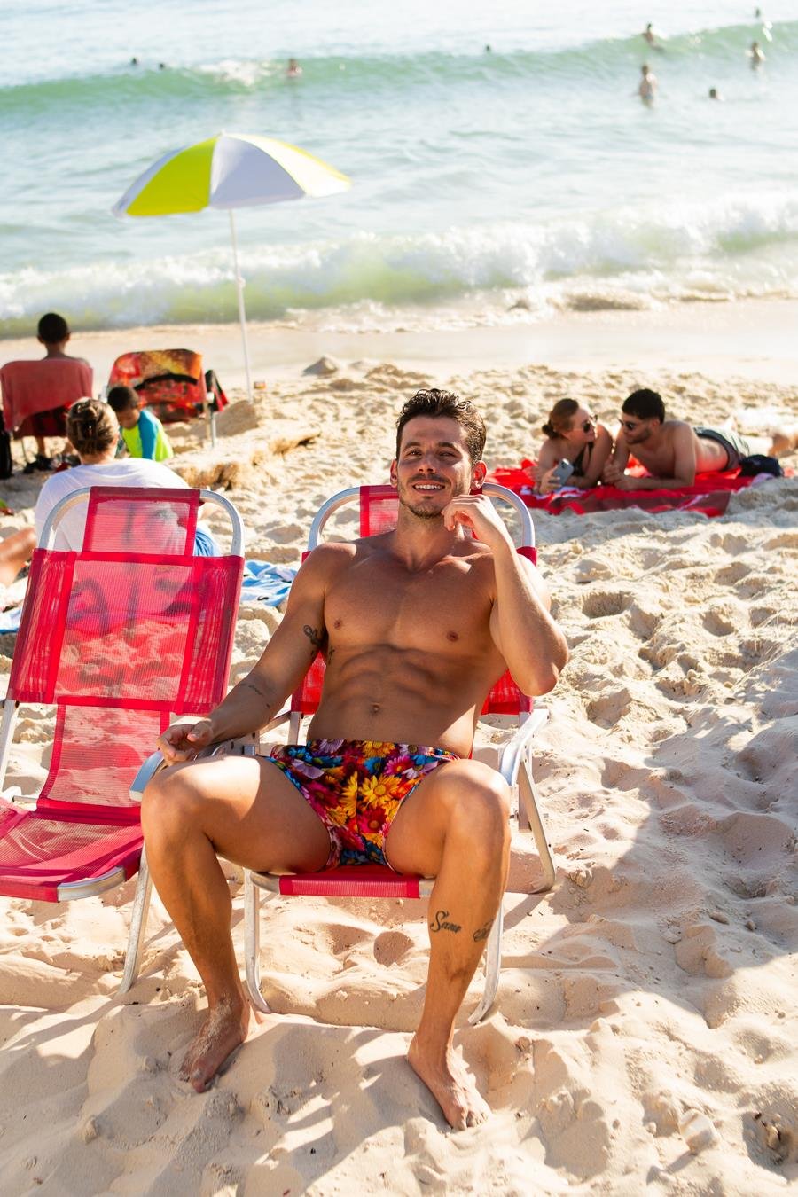 Dono de um corpo definido, o modelo exibiu sua boa forma durante as fotos realizadas pelo fotógrafo Beto Urbano no litoral do Rio de Janeiro.